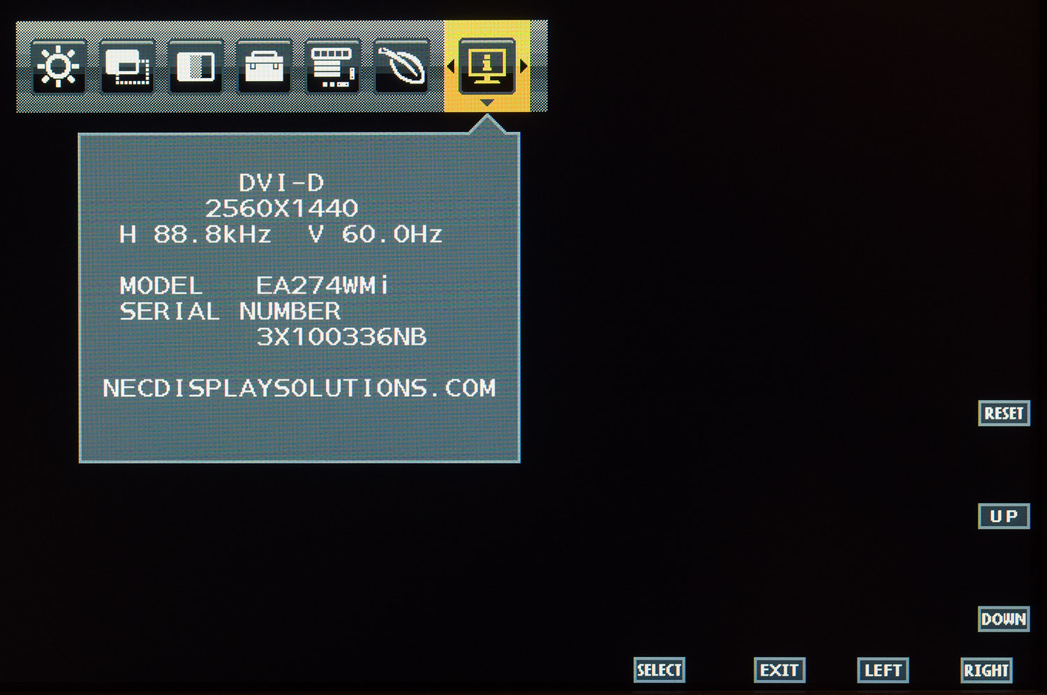 Доступ к сервисному меню в случае с моделью NEC EA274WMi найден не был. При любых сочетаниях кнопок или зажатии какой-то одной из них монитор отказывался включаться.