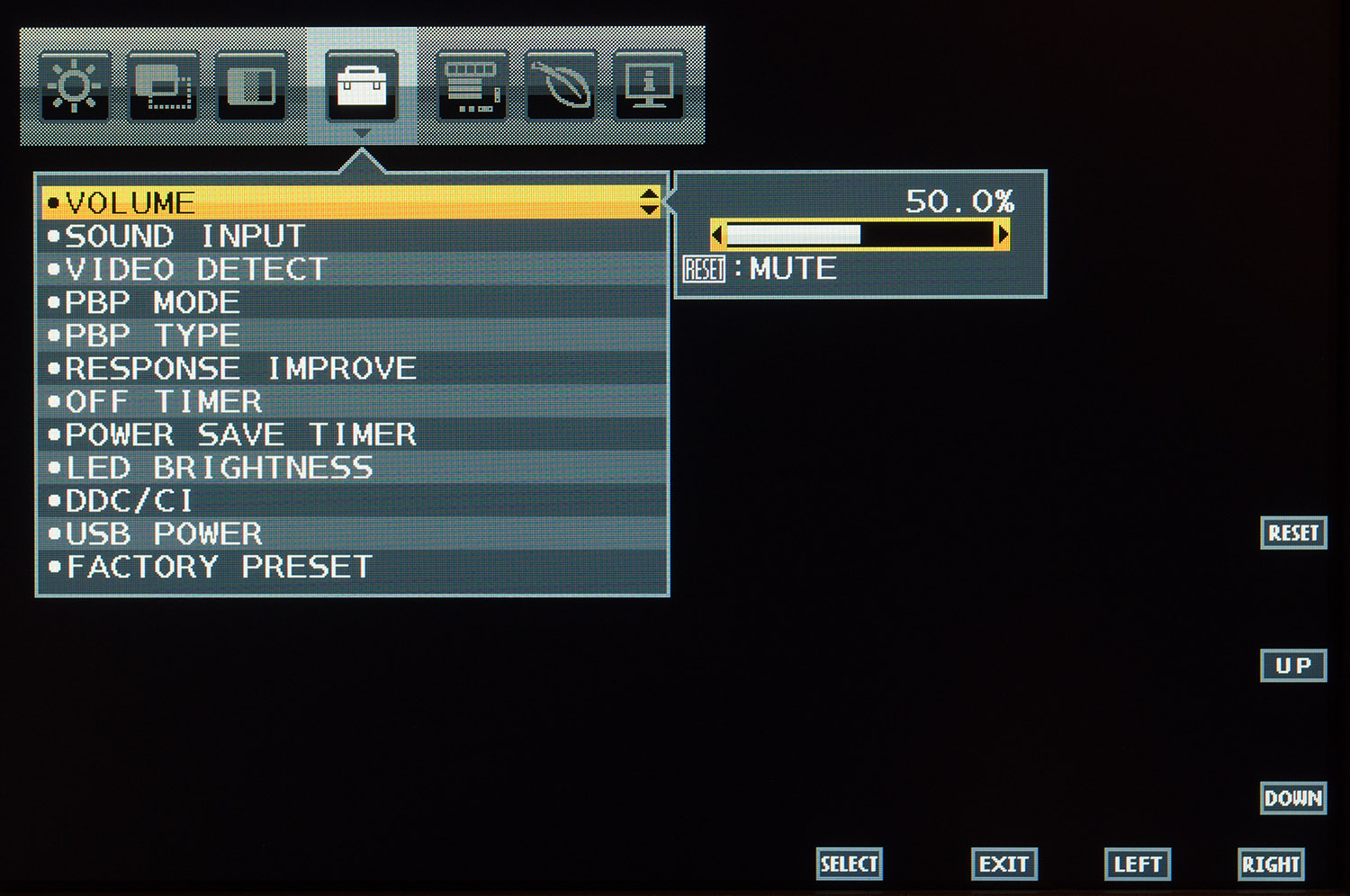С помощью некоторых сенсорных кнопок быстрый доступ можно получить к регулировке яркости подсветки, уровню громкости встроенной акустической системы (довольно низкого качества), переходу к иному источнику сигнала и включению PbP режима.