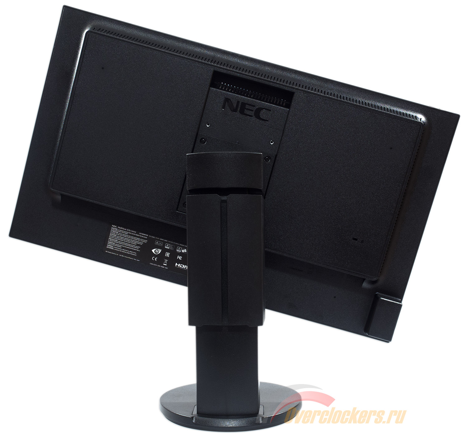 Центральная колонна прикреплена к корпусу уже с завода с помощью четырех винтов. Как и полагается – присутствует VESA совместимое крепление. Два дополнительных отверстия в корпусе (около логотипа NEC) позволят произвести крепеж на разной высоте. Для удобства переноски в верхней части корпуса можно встретить специальное углубление – ручку.