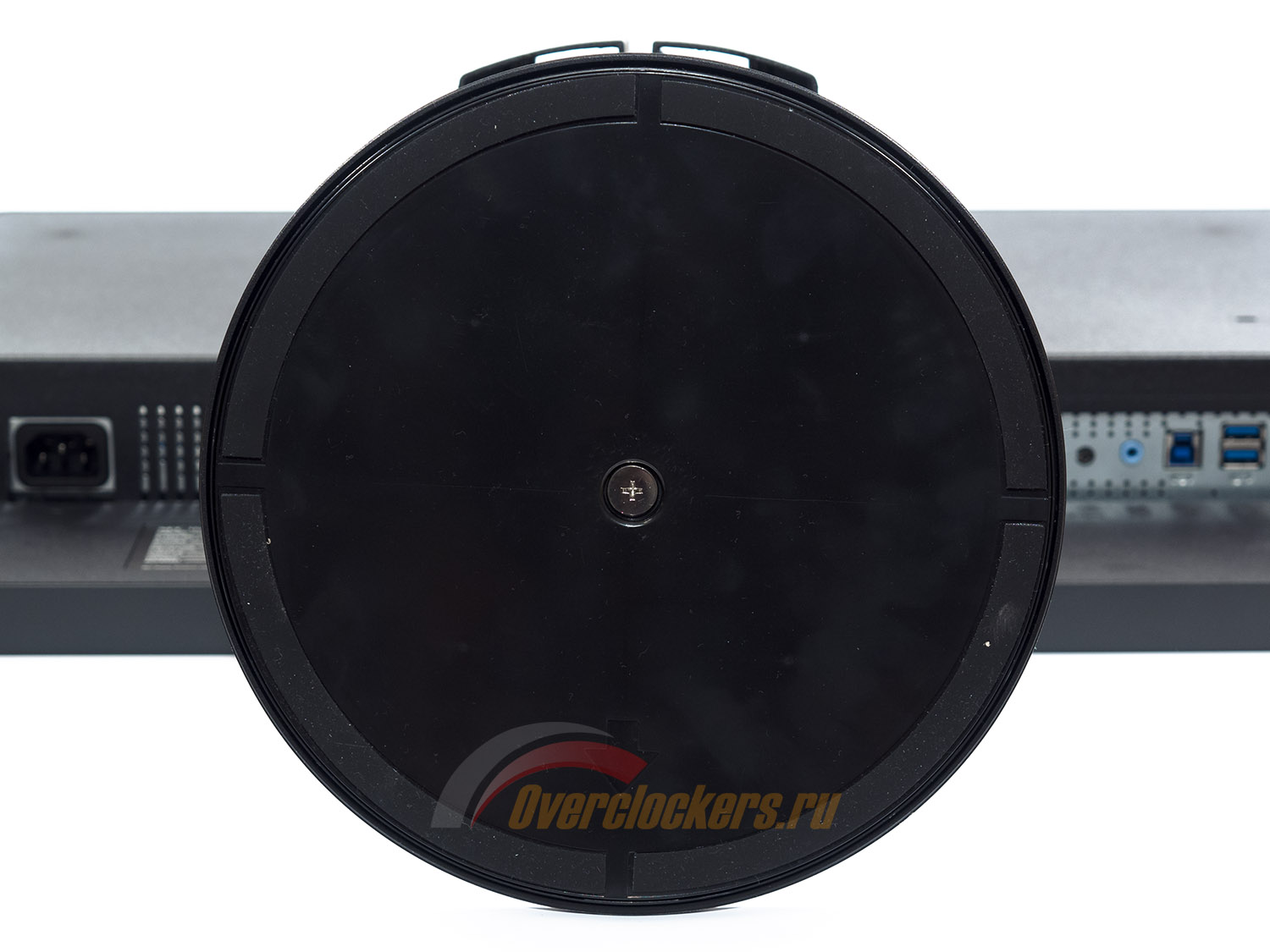 Круглая подставка с небольшим наклоном вперед и сдвинутым назад креплением центральной колонны отличается качественной проработкой элементов и совсем не пугает своими размерами.