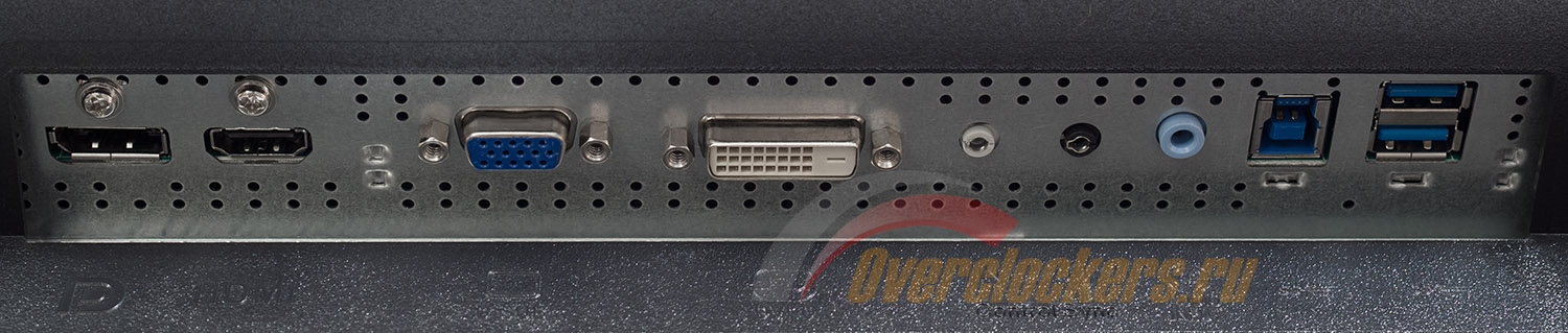 Основные разъемы для подключения находятся в задней части корпуса и ориентированы вниз. Среди них: питание, аналоговый D-Sub, цифровые DVI-D, HDMI, DisplayPort, USB выход (для подключения к ПК), два USB 3.0, аудиовыход, Control Sync-Out, Control Sync-In.