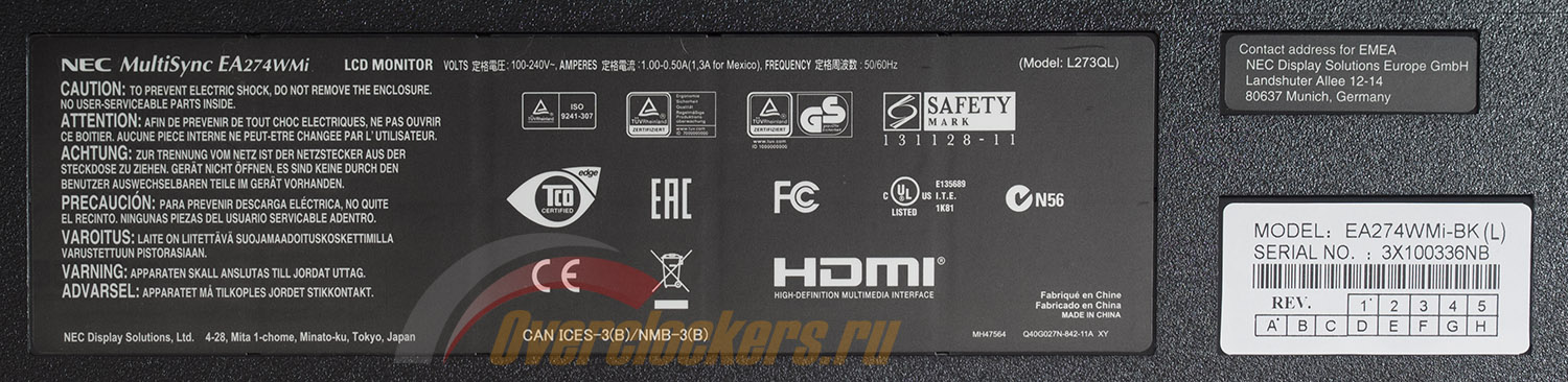 На корпусе рассматриваемого устройства присутствуют два логотипа компании, наклейка о соответствии стандарту Energy Star, а также напоминание о серии и модели монитора – MultiSync EA274WMi.