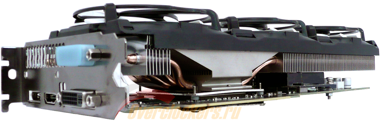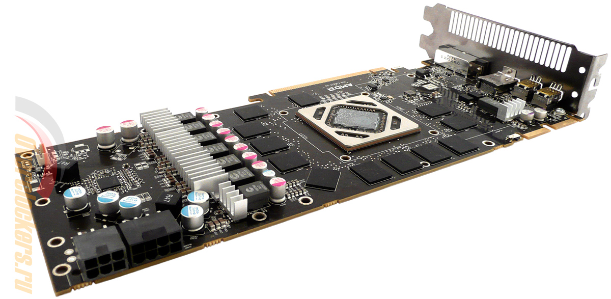 Кто-то может возразить, что у видеокарт AMD кожух претерпел определенные изменения, но это внешне, а внутренняя конструкция осталась такой же, как и в случае с Radeon HD 7970. Единственное значительное изменение – отсутствие привычных разъемов для CrossFireX, хотя «след» очертания остался. Нет, компания не отказалась от идеи мультиграфических связок, просто теперь это реализовано иначе. И больше не надо искать затерявшийся мостик, достаточно просто установить желаемое количество.
