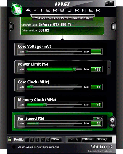 Кроме того, при использовании MSI Afterburner, которым производился разгон GPU, при выставлении оборотов вплоть до 38% не происходило никаких изменений ни в части увеличения оборотов вентиляторов, ни в части определения их числа в GPU-Z и HWiNFO64. При применении ручного режима программы мне так и не удалось настроить шкалу так, чтобы оптимизировать работу вентиляторов на «смешанной» системе. Картина начинала проявляться после выставления значения 39% и то, местами. Но оказалось, что установленные на VGA-кулерах вентиляторы с отметки 40% и выше начинали работать на своих максимальных оборотах. Проще говоря, режима «Auto» для альтернативных систем охлаждения на эталонной GTX 780 Ti не предусмотрено.