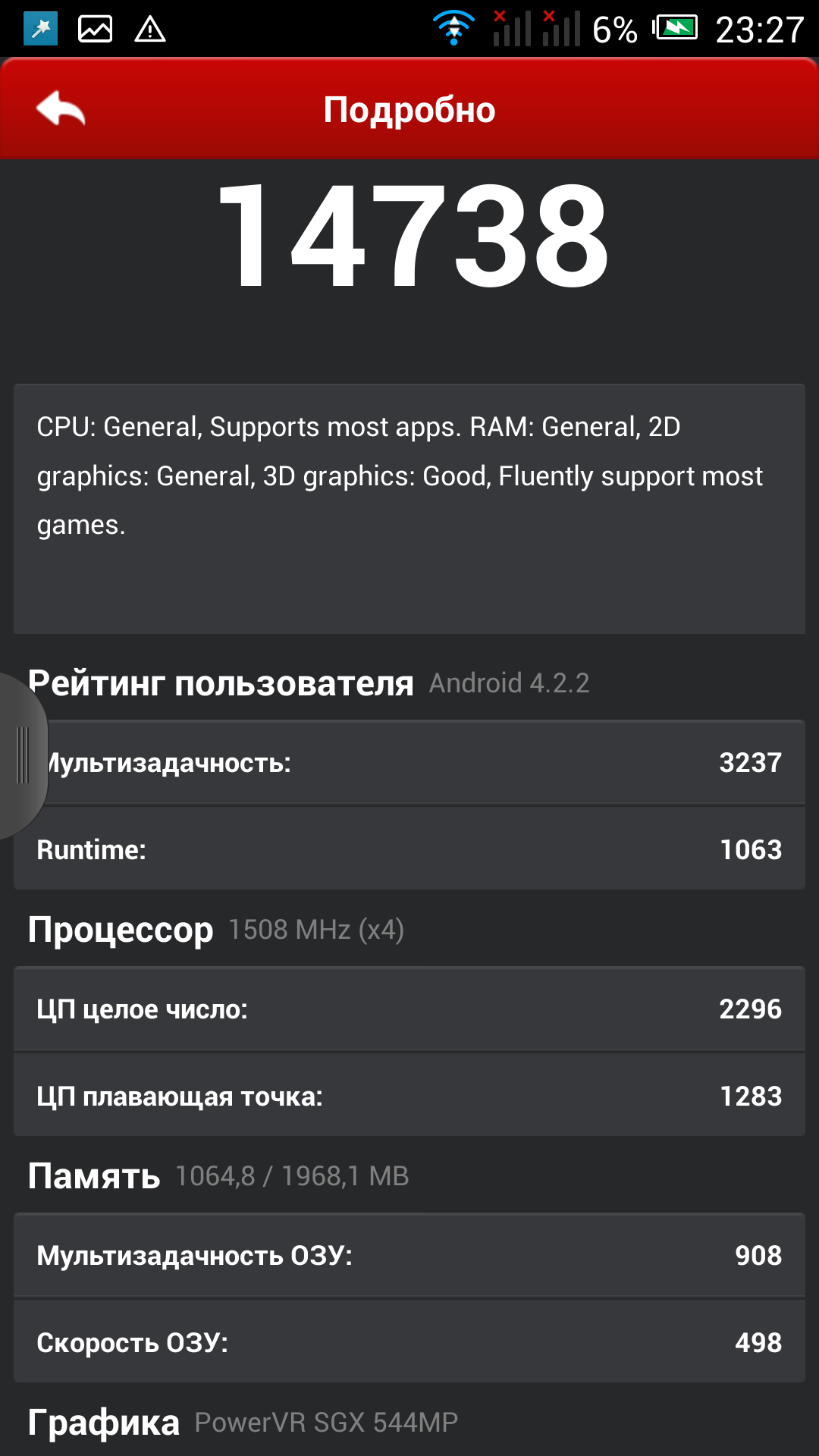 На свежем телефоне доступно около 1.5 Гбайт оперативной памяти из 1900, что является очень хорошим результатом, не в пример некоторым моделям Samsung.