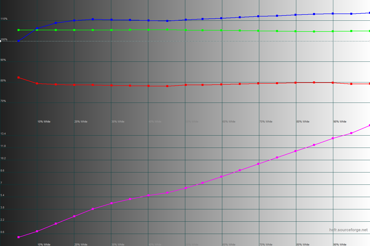 График RGB Levels уже привычно является дополнением к CIE и Color Temperature. По нему мы видим, как настроены цветовые каналы во всём изучаемом диапазоне. Здесь все неплохо, и даже красный идет более или менее ровно – это встречается нечасто. А то, что синий и зеленый окажутся заметно выше, было и так понятно по цветовой температуре.