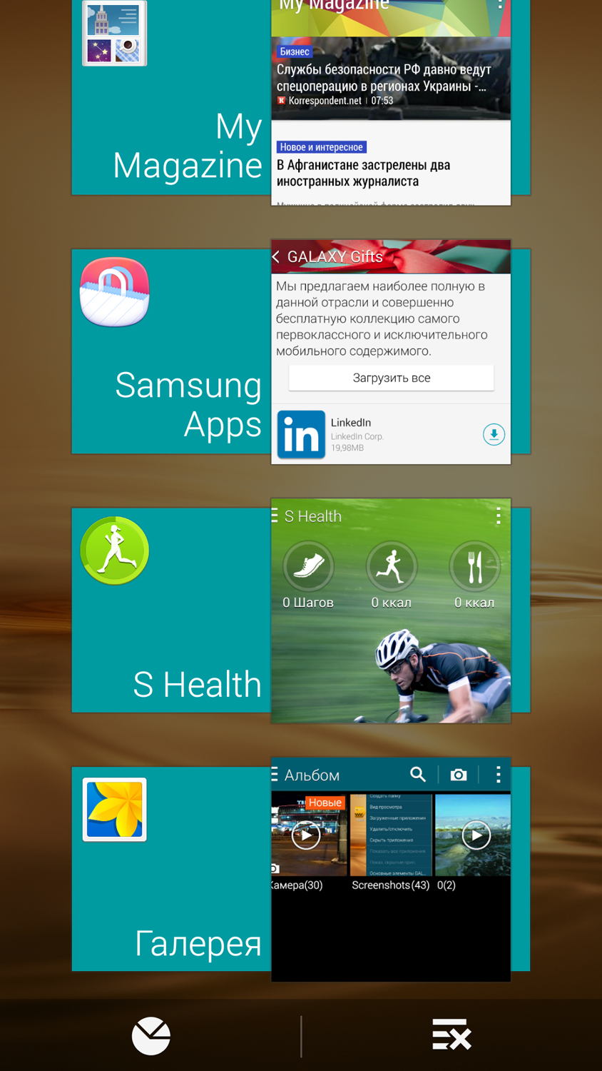 Объем оперативной памяти производитель оставил без изменений со времен Galaxy S4 – 2 Гбайта. Сразу после загрузки свободно больше гигабайта – а вот тут по сравнению с предыдущей моделью прогресс: аппетиты фирменной оболочки TouchWiz удалось снизить. Однако стоит смартфону немного поработать, и ситуация становится стандартной для аппаратов с горой дополнительного ПО. Кнопка «Зав. все» будущему владельцу пригодится: