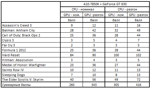 - A10-7850K @ 4500 МГц (R7 240 @ 960/2133 МГц) в паритете (+/-3%) с A10-7850K @ 4500 МГц (HD 6670 @ 950/4800 МГц);