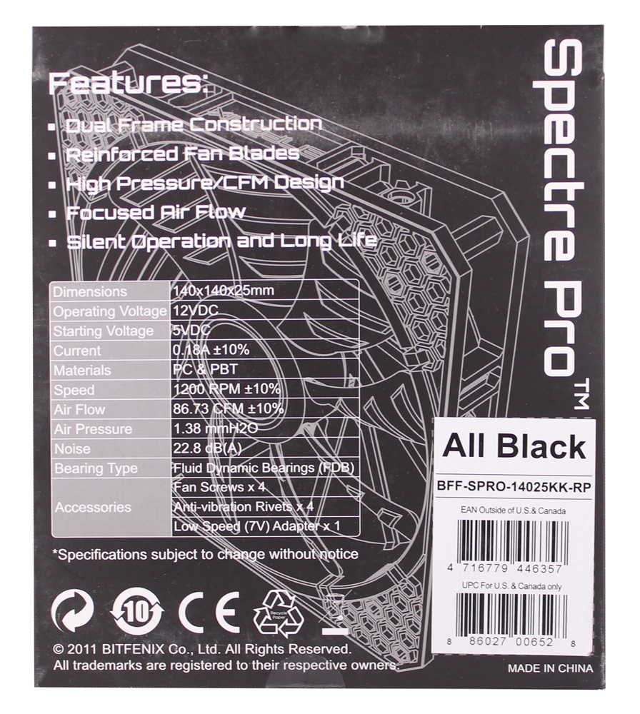 Компания BitFenix, известная своими корпусами системных блоков, также выпускает несколько моделей вентиляторов и время от времени они попадают в нашу лабораторию. На этот раз для теста был взят Spectre Pro 140 мм.