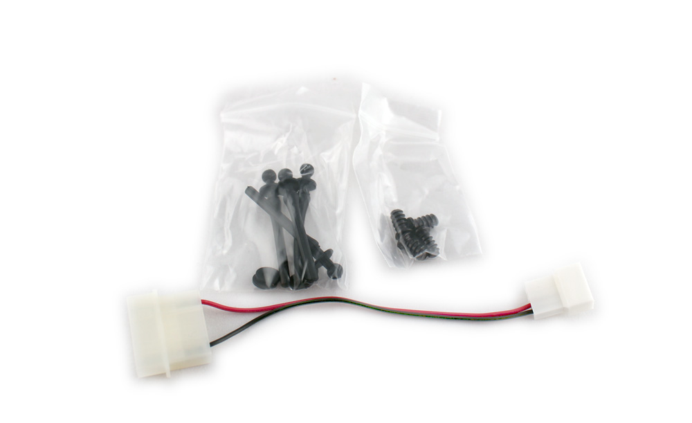 Комплект поставки состоит из дополнительной решетки, набора винтов для крепления и переходника питания с 3-pin на 4-pin Molex. Надо сказать, что аксессуары сделаны очень просто, качество пластика у рамки слабое, что немного удешевляет общий внешний вид вентилятора, а внутри переходника все разъемы болтаются, но это привычные проблемы для недорогих решений.