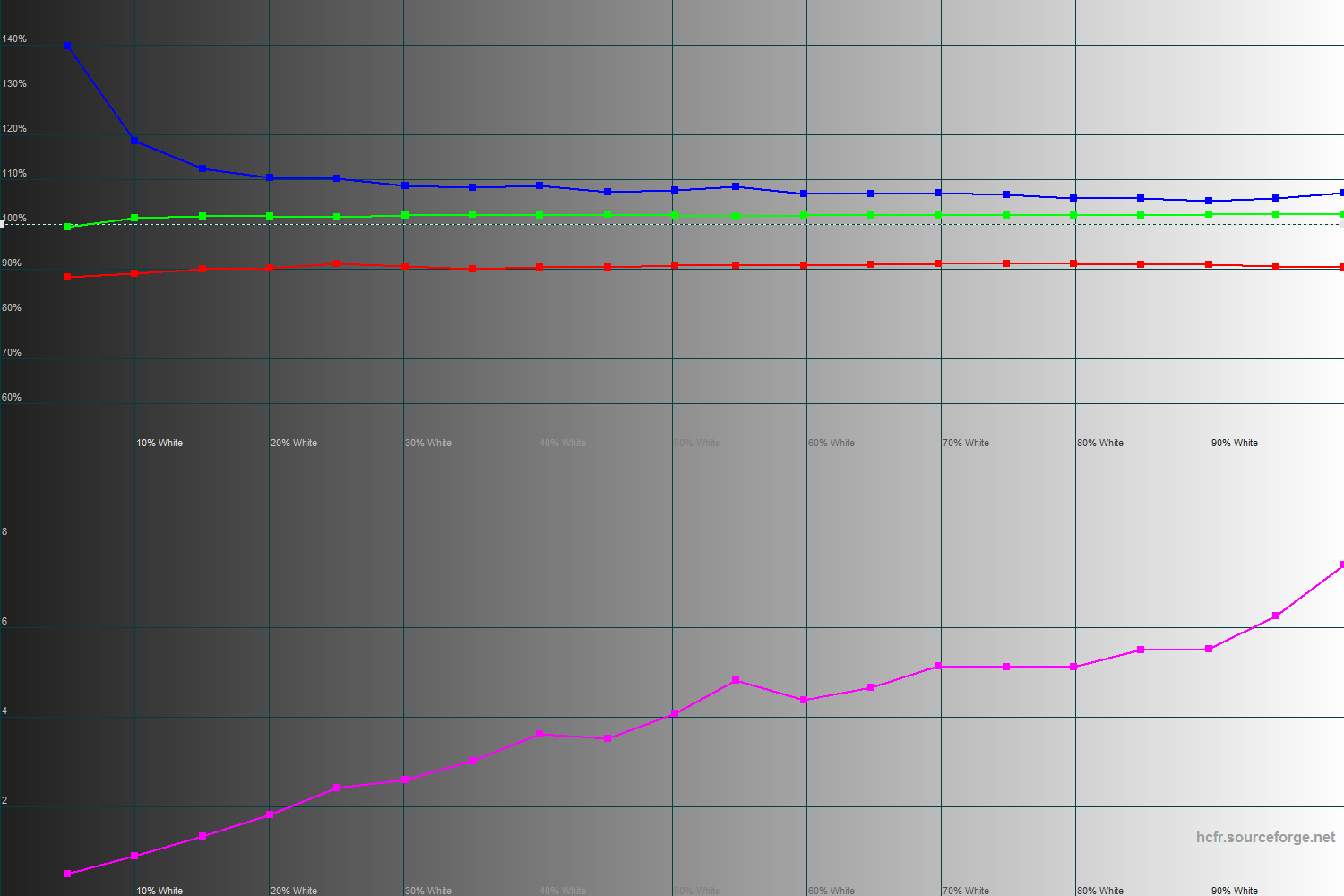 На черном фоне есть как яркостная, так и цветовая неравномерность, с небольшим уклоном в синеву. Тем не менее, абсолютная величина засветки настолько мала, что какого-либо дискомфорта не создает. Кроме того, нет сильно заметных пятен повышенной яркости у краев и по углам.