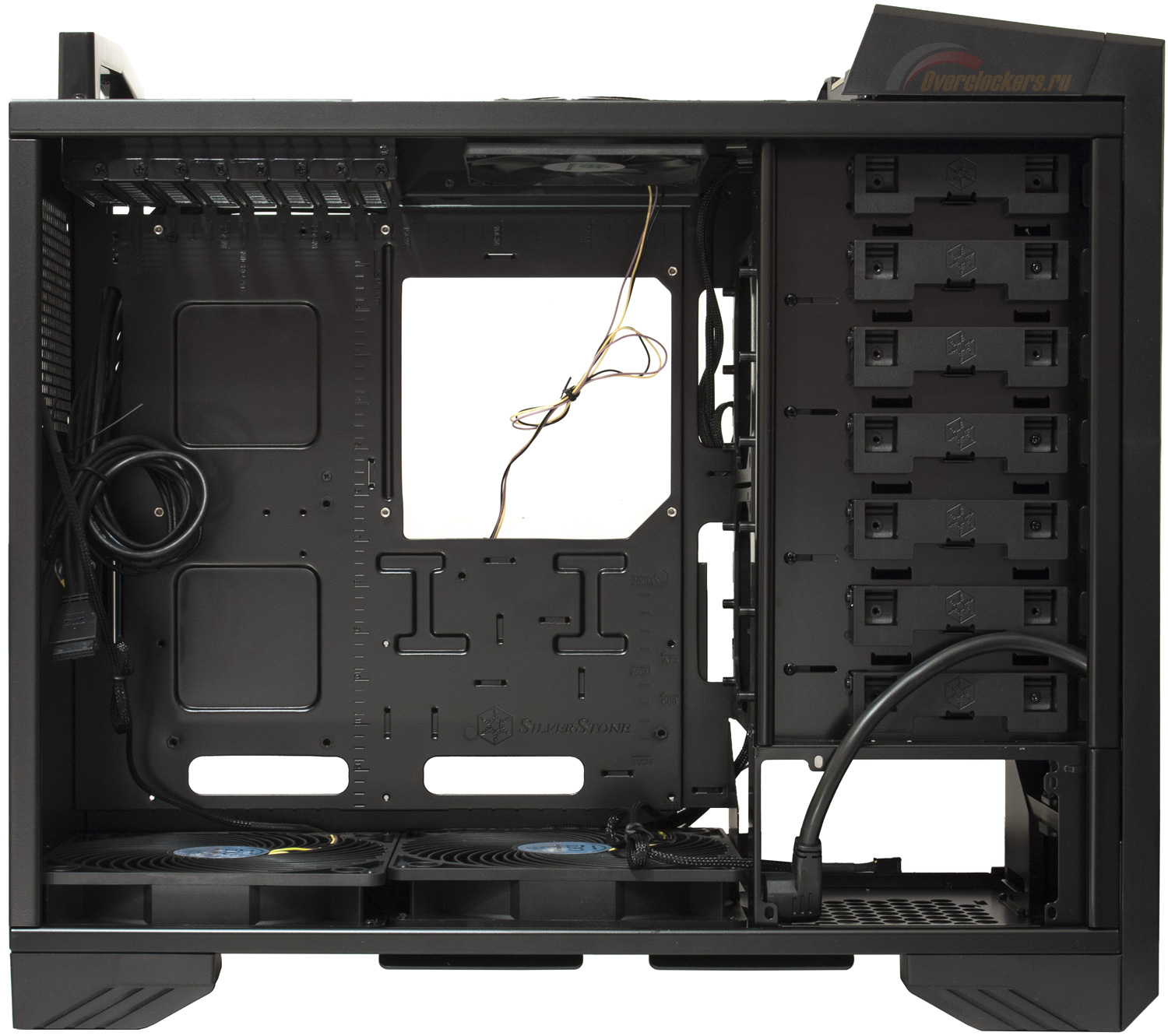 При подобном размещении системной платы, продувка корпуса в этом случае осуществляется снизу-вверх, причем нагнетателями прохладного воздуха выступают два 180 мм вентилятора, расположенные на днище, какие-либо препятствия (в виде корзин HDD и прочего) на пути воздушного потока отсутствуют.