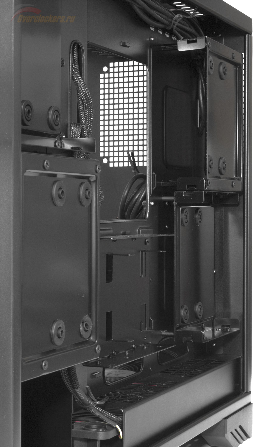 Здесь же, за поддоном, располагаются основные посадочные места для накопителей. Четыре штуки для 3.5-дюймовых жестких дисков и один отсек для двух SSD накопителей в центральной части.