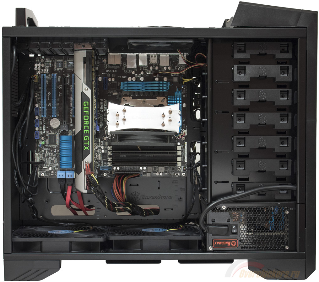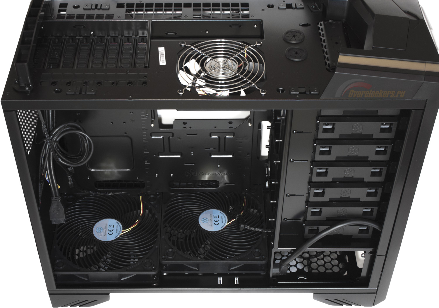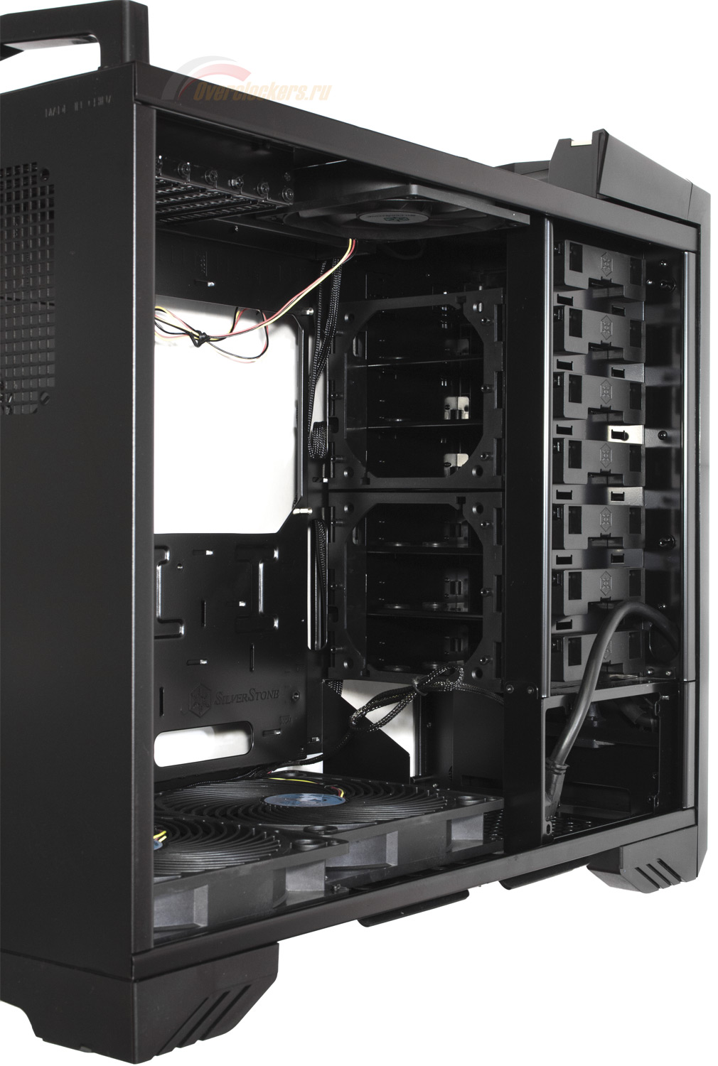 Победа во многом одерживается благодаря эффективному продуву корпуса. Мощный поток прохладного воздуха с двух нижних 180 мм вентиляторов, почти не встречая на своем пути сопротивления, полностью обдувает как материнскую плату, так и установленные компоненты.