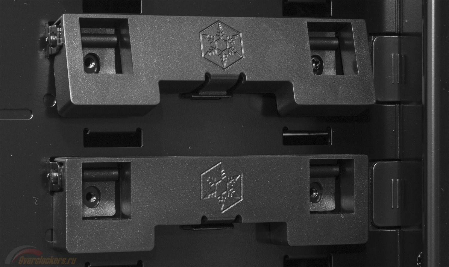 Сдавливание происходит лишь в центральной части прокладки, где она частично выпирает наружу. Посему накопитель, можно сказать, висит в воздухе, вибрируя на так называемых «пружинах». Такая конструкция должна максимально уменьшить передаваемую с HDD на корпус вибрацию, если совсем не исключить ее. Очень мудрый подход инженеров Silverstone.