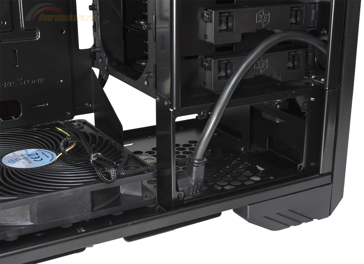 Что касается охлаждения жестких дисков, то установленные за поддон системной платы «винчестеры» призваны обдуваться нижними 180 мм вентиляторами. Вот только на кронштейнах HDD отсутствует какая-либо перфорация, что может свести эффективность обдува к минимуму.