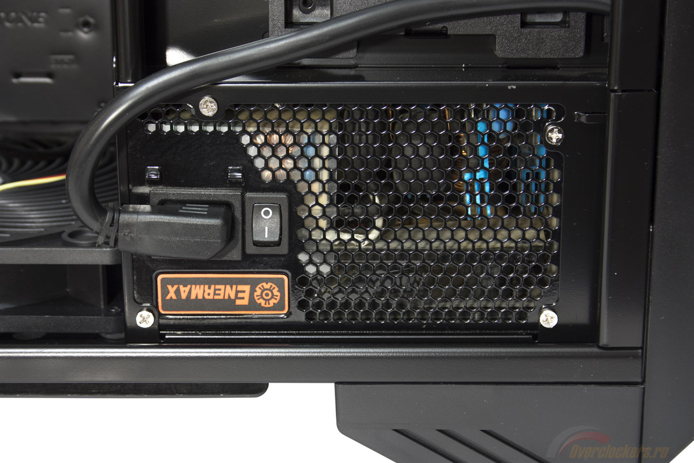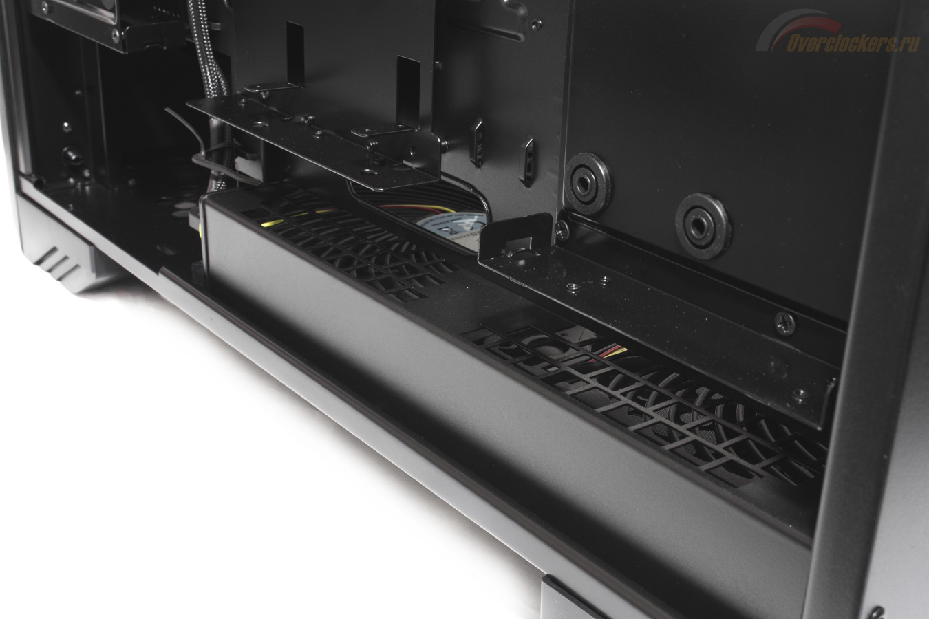 Блок питания размещается в передней нижней части корпуса на специальных пазах. Какая-либо мягкая «посадка» отсутствует. Ориентация БП может быть лишь в одном положении – вентилятором вниз. Что касается максимальной длины блока, то, как заявляет производитель, она составляет 180 мм.