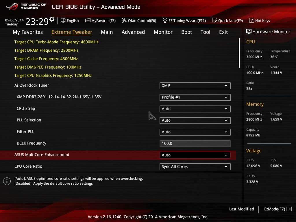 Она очень большая потому, что на ней находится много различных пунктов. Однако сначала давайте ознакомимся с интерфейсом. В верхнем левом углу расположен логотип ROG. Правее есть надпись UEFI BIOS Utility - Advanced Mode. Это говорит о том, что перед нами расширенное меню настроек, а не привычная стартовая страница EZ Mode. Ниже идет первая полоса меню, а точнее даже набор кнопок для быстрого доступа к некоторым функциям. Слева находятся часы и там же отображается текущая дата. А вот ниже уже действительно находится меню-бар. Кстати, обратите внимание, что Extreme Tweaker это второй пункт.