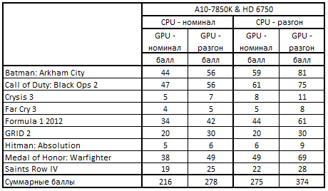 - A10-7850K @ 3700 МГц (R7 240 + R7 250) быстрее A10-7850K @ 3700 МГц (HD 6750 @ 700/4600 МГц) на 40 - 44%;