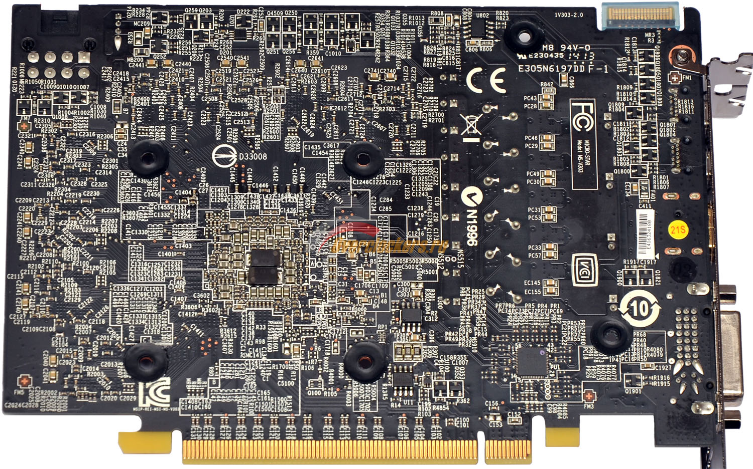 Большую часть обратной стороны видеокарты занимает металлическая пластина, через которую прикручена система охлаждения. Пластина крепится на шесть точек – четыре вокруг графического процессора, и еще две в районе преобразователя питания GPU/AUX/памяти. С учетом небольшой площади текстолита шести винтов вполне достаточно, чтобы достичь равномерного прижима системы охлаждения и избежать изгиба платы.