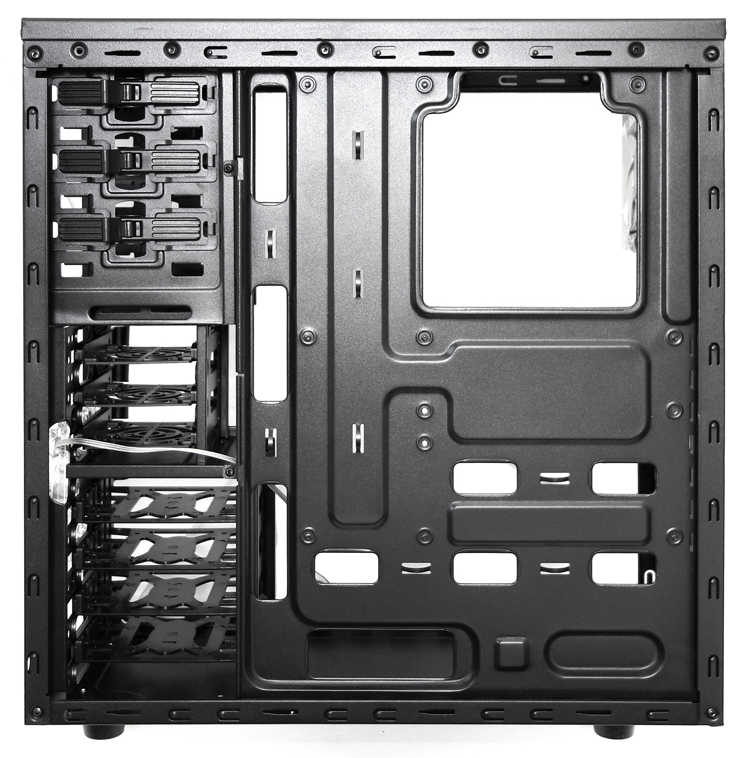 Боковая стенка оснащена посадочными местами под два вентилятора диаметром 80/90/120 мм, применяется ячеистая перфорация: