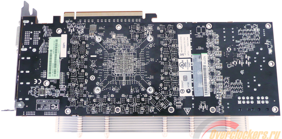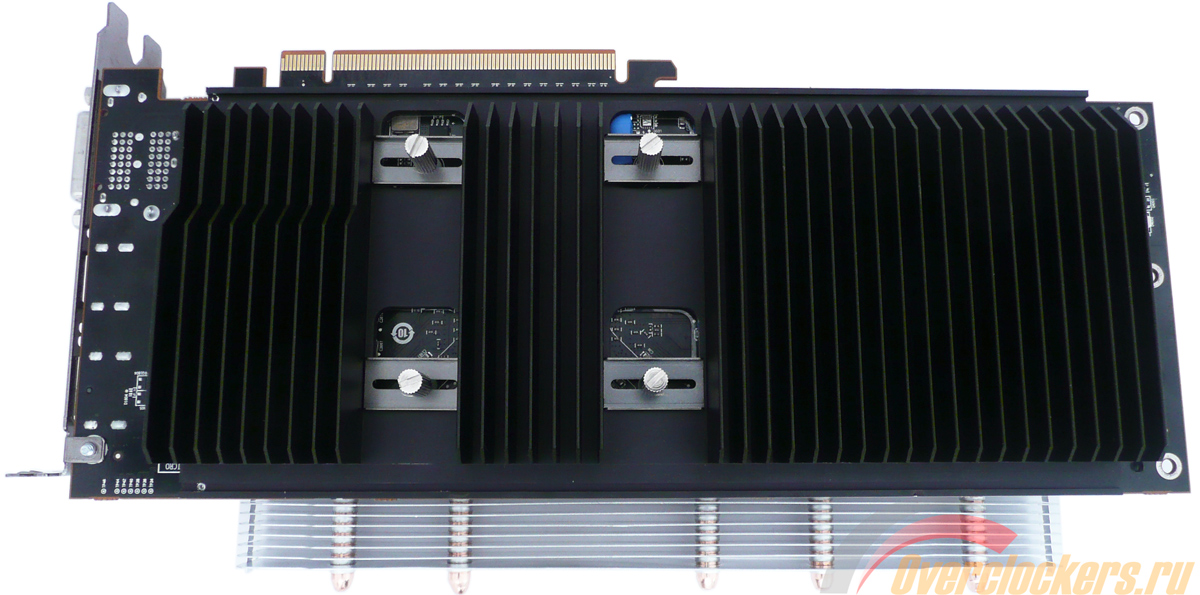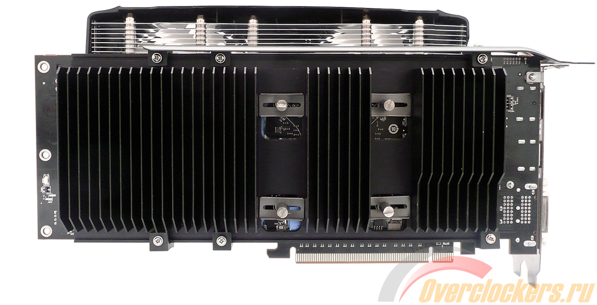 В секторе графического процессора ребер всего семь, а в хвостовой части их уже двадцать. И снова это сделано не по простой прихоти разработчиков, но с учетом четырех универсальных прямоугольных отверстий, благодаря которым с помощью шайб и контргаек происходит фиксация самой пластины на PCB через термопрокладки, а также подошвы VGA-кулера с поверхностью кристалла.