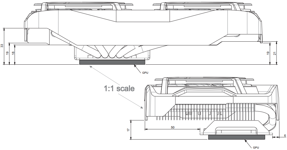 Радиатор образует общий массив 210 х 95 х 21 мм, состоящий из тридцати пяти алюминиевых пластин, толщиной 0.4 мм, которые напрессованы на пять медных шестимиллиметровых тепловых трубок. Как уже упоминалось выше, на медную подошву нанесена термопаста MX-4. На мой взгляд, лучше бы производитель приложил к комплекту тюбик с термоинтерфейсом для самостоятельного нанесения на поверхность GPU.