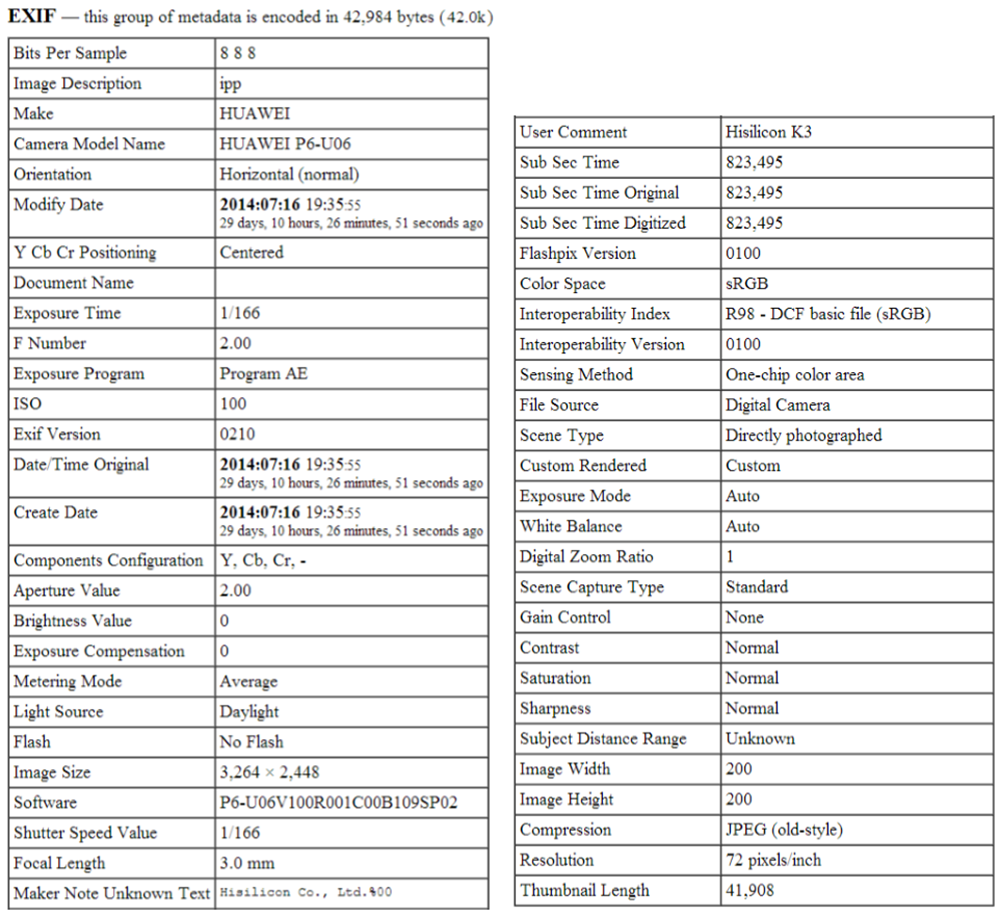 Информация EXIF фото- и видео файлов, полученных при помощи камеры Huawei Ascend P6.
