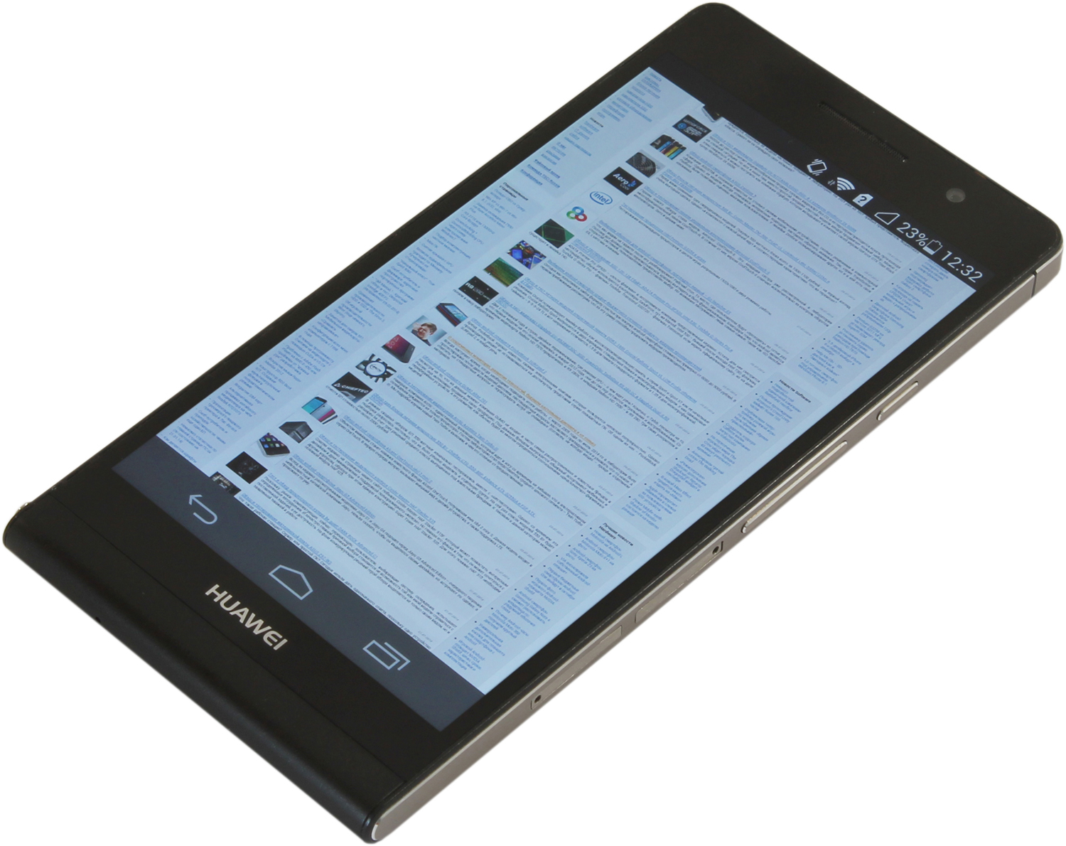 Смартфон выглядит очень компактным. Грани и углы сглажены минимально, в целом устройство выделяется строгими прямыми формами. Держать гаджет удобно, P6 поместится в любую руку. А текстура задней крышки приятна на ощупь и позволяет корпусу не выскальзывать из рук.