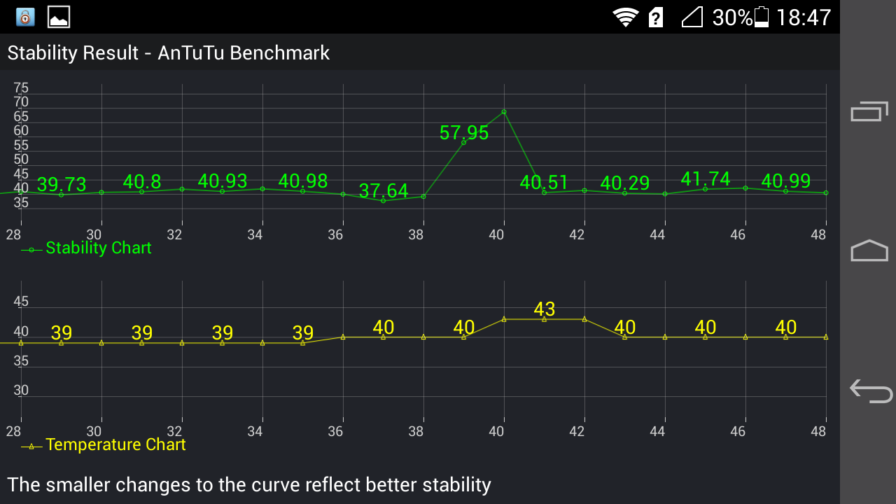Проверка стабильности устройства в целом прошла успешно. Ascend P6 не выдает ошибок и сбоев при длительной максимальной нагрузке. Но есть серьезная проблема, которая заключается в том, что температура корпуса поднимается до очень высоких значений и физически ощущается, как обжигающая.