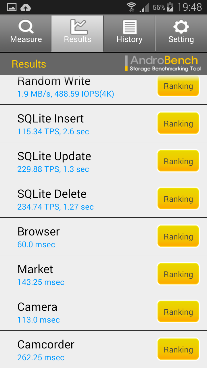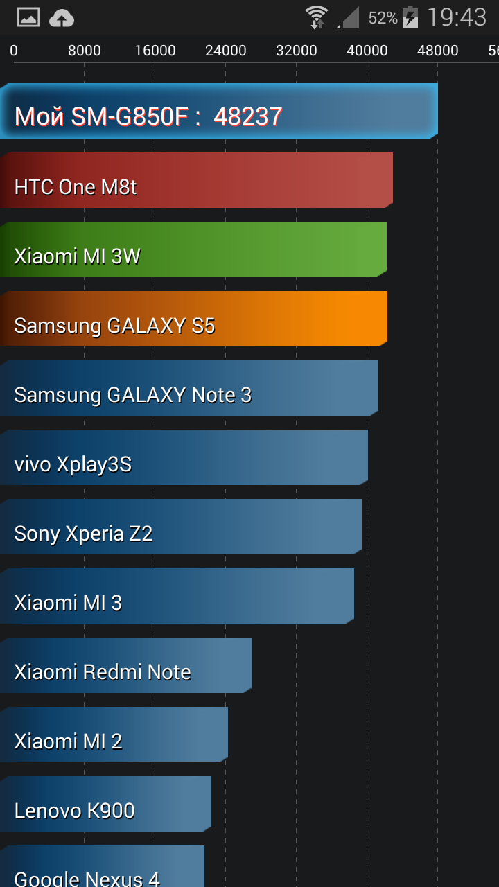 По версии AnTuTu Benchmark герой обзора оставляет позади абсолютно всех, даже собственного старшего брата – Galaxy S5. Что ж, результат соединения топовой начинки и HD экрана не заставил себя ждать.