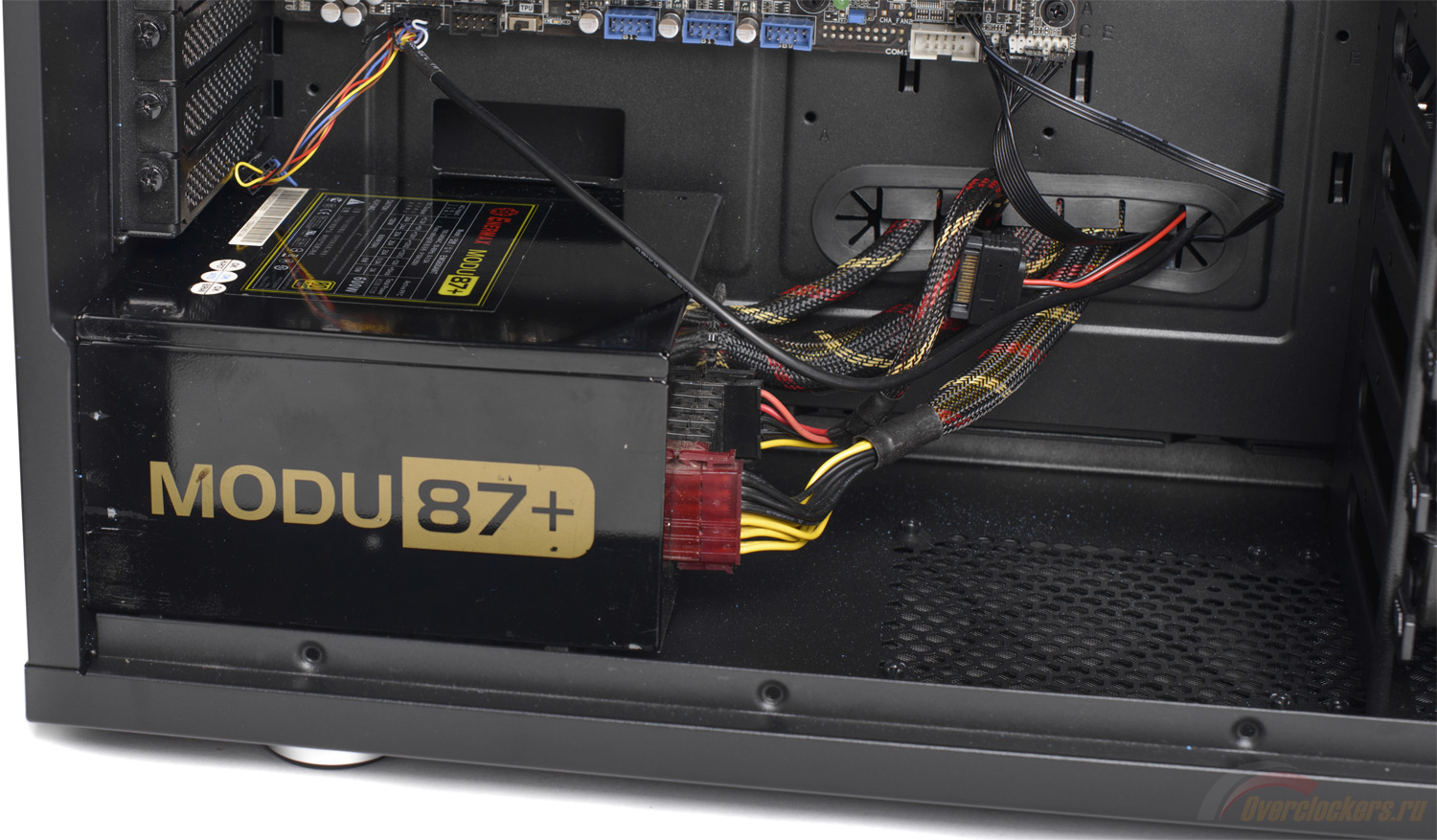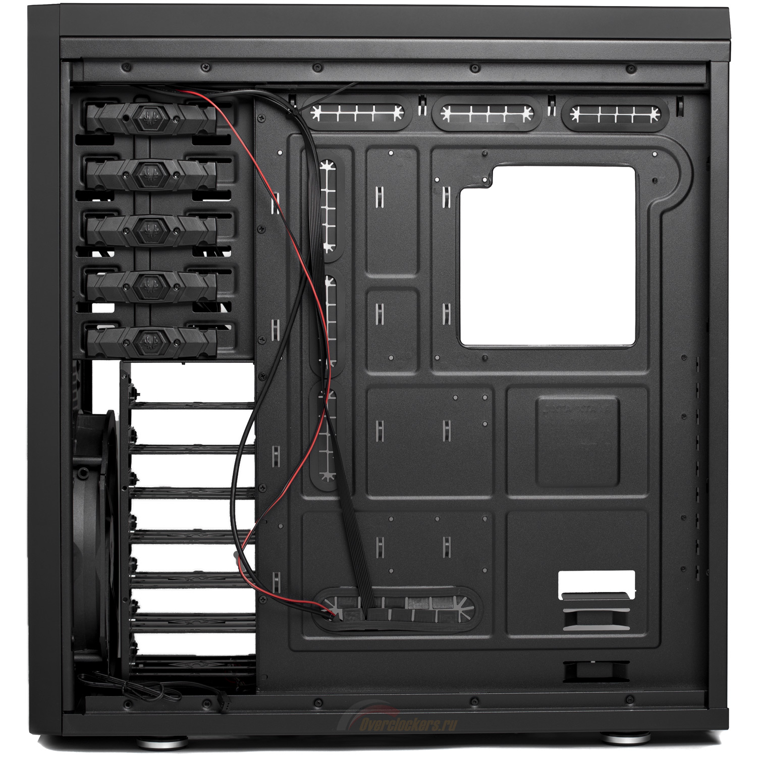 Обратная сторона нашпигована кронштейнами для крепления стяжек проводов, здесь предусмотрен большой вырез для доступа к крепежной крестовине кулера CPU.