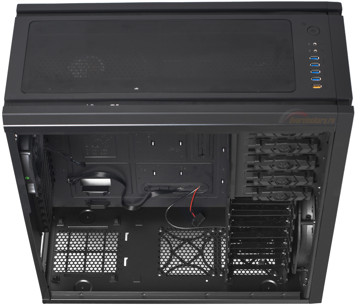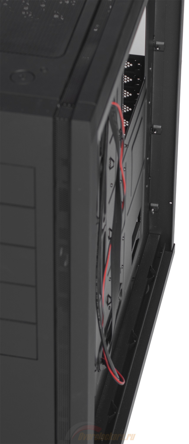 Фронтальная панель монолитна. На ней отсутствует какая-либо перфорация, забор прохладного воздуха осуществляется через вентиляционные отверстия по бокам лицевой панели, где размещены узкие вертикальные прорези во всю высоту корпуса, закрытые мелкоячеистой сеткой. А ее верхнюю половину занимают пять 5.25-дюймовых отсеков, в середине же красуются блестящие «крылья» – логотип производителя.