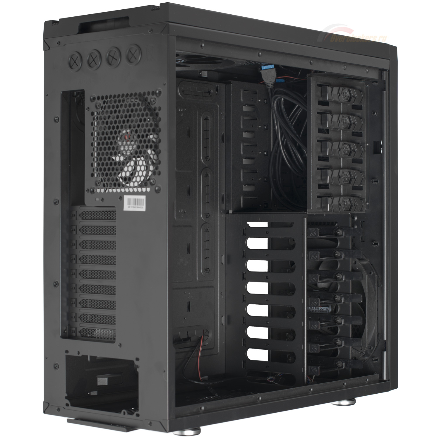 Гиганты 230 мм размещаются по одному на фронтальной и верхней панелях (в нижней и задней части). Фронтальный осуществляет забор воздуха, охлаждая жесткие диски, а верхний функционирует на выдув. Замеренная скорость вращения крыльчатки – ~800 об/мин.