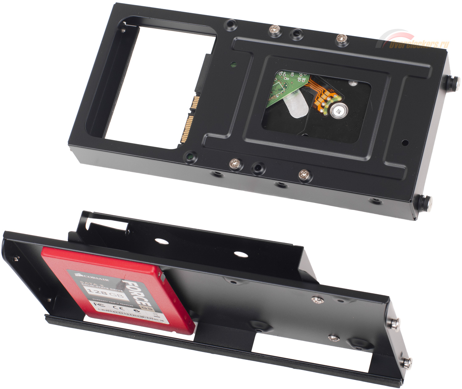 Оба кронштейна вставляются в специальные пазы в шасси, без применения винтов. Средний, предназначенный для 3.5-дюймового жесткого диска, в месте соприкосновения с боковинами оборудован силиконовыми прокладками, обеспечивающими защиту от вибрации.