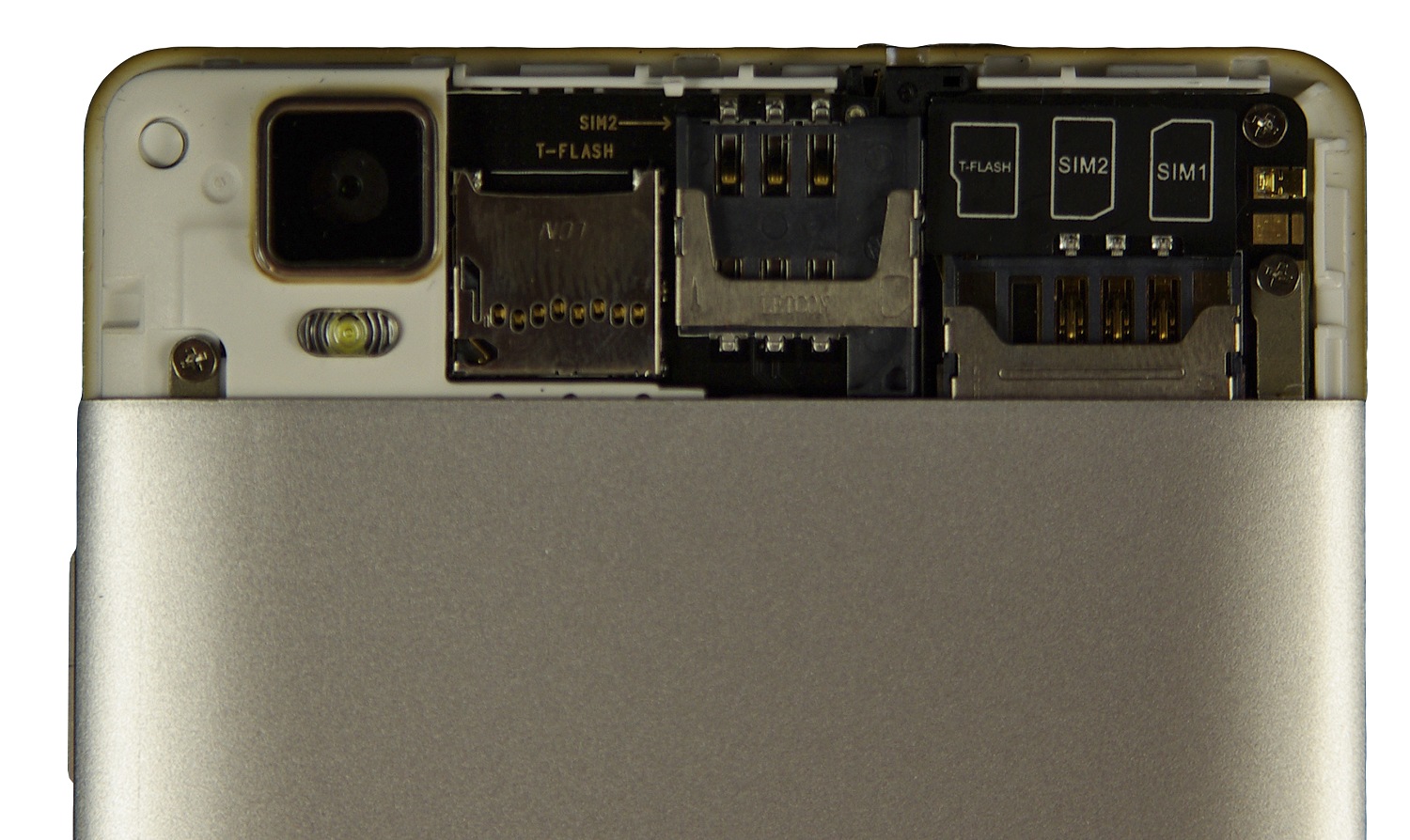 Задняя крышка снимается не вся, только ее верхняя пластиковая часть. После этой процедуры мы получаем доступ к двум слотам microSIM и слоту для карты памяти (MicroSD). Аккумулятор несъемный. Возможности «горячей» замены сим-карт и карты памяти не предусмотрено.