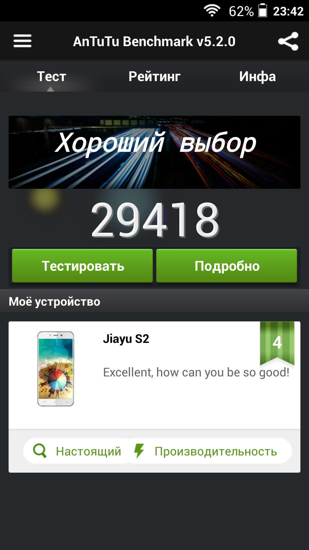 Герой обзора играет в популярной и богатой разными гаджетами ценовой нише. Конкурентов много, а большинство из них предлагает практически аналогичные параметры. Кстати, если вам не требуется такой объем памяти, можете обратить внимание на модификацию Jiayu S2 Basic и сэкономить несколько тысяч рублей.