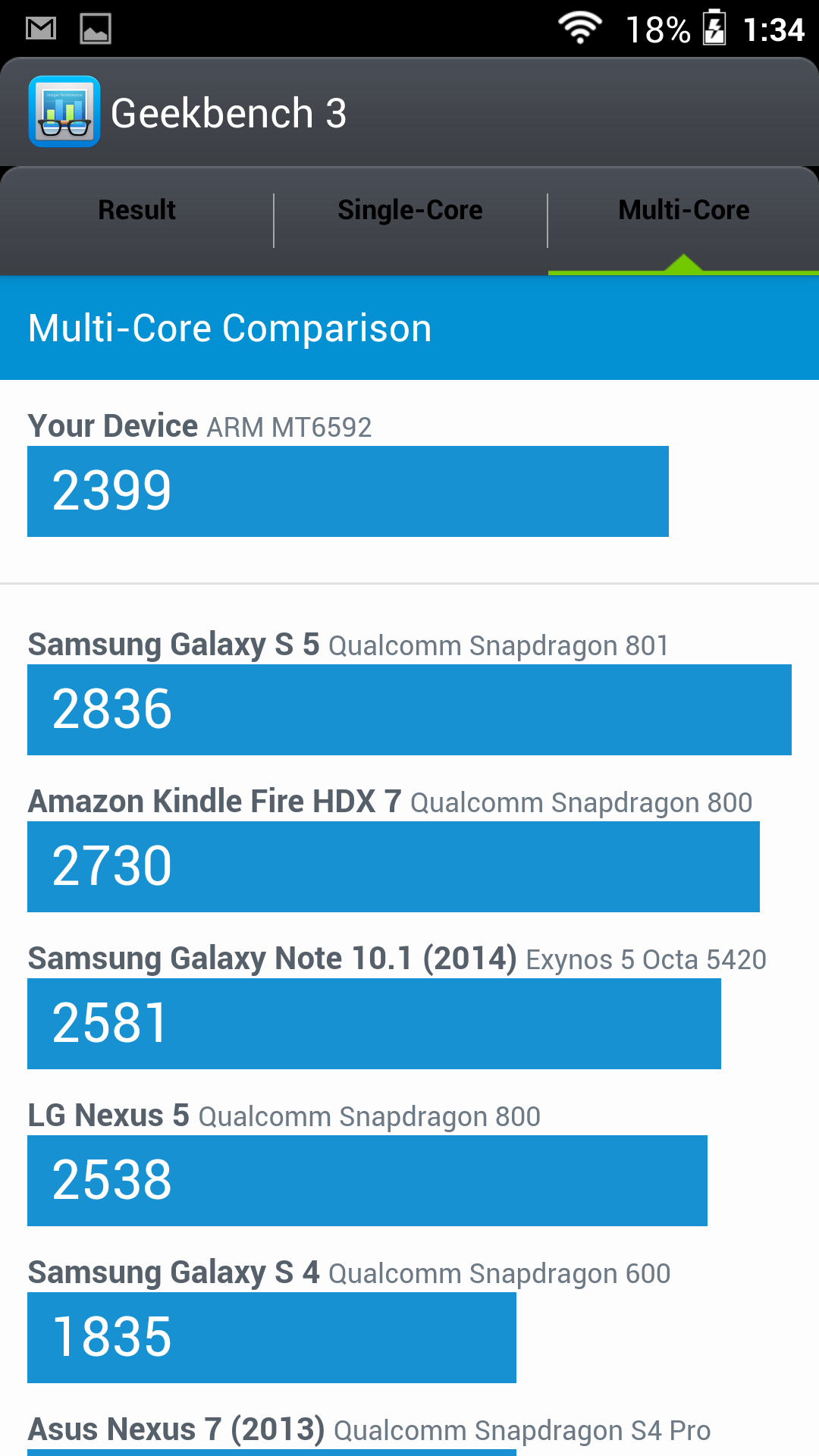 Не стал исключением и герой обзора – внутри тонкого корпуса трудится знакомый всем чип. Это MTK6592 с тактовой частотой 1.7 ГГц и восемью вычислительными ядрами.