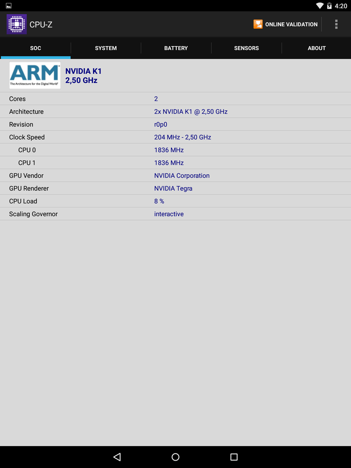 Перед тем, как посмотреть на результаты тестирования производительности, приведем показания CPU-Z. Здесь максимальная частота процессора фиксируется на уровне 2.5 ГГц. Видимо, официальные источники ошибаются, указывая частоту 2.3 ГГц, так как двухъядерный K1 Denver (в отличие от K1 Cortex A15) должен работать именно на частоте 2.5 ГГц.