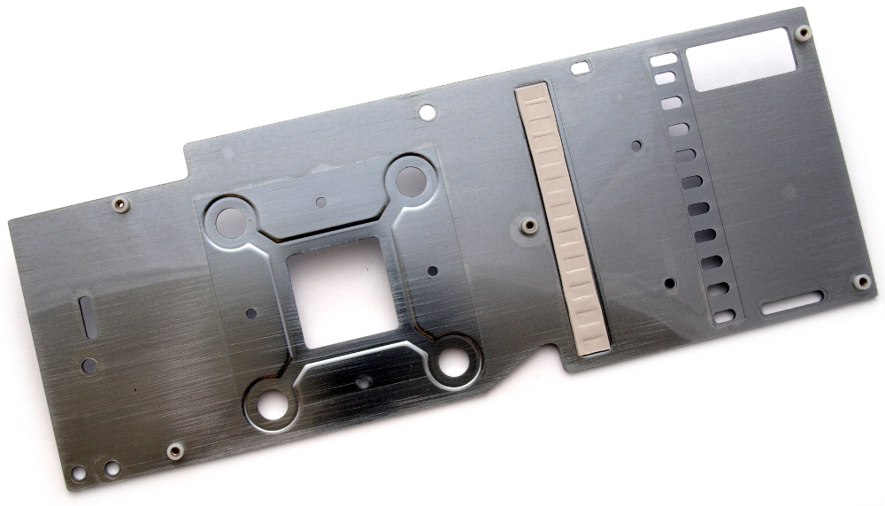 Далее, чтобы снять оставшиеся элементы охлаждения нужно постараться. Разработчики решили убить двух зайцев одновременно: уменьшить количество применяемых винтов, которых, к слову, набежало аж семь разных типов и размеров и в общей сумме около 16, и уменьшить выгиб пластины в ту или иную сторону, так как она одновременно притянута в оба направления. Сначала откручиваем два у пластины для микросхем памяти, один по центру и два на краю платы, переворачиваем карту и вывинчиваем еще два у обратной стороны. После таких манипуляций аккуратно ее снимаем.
