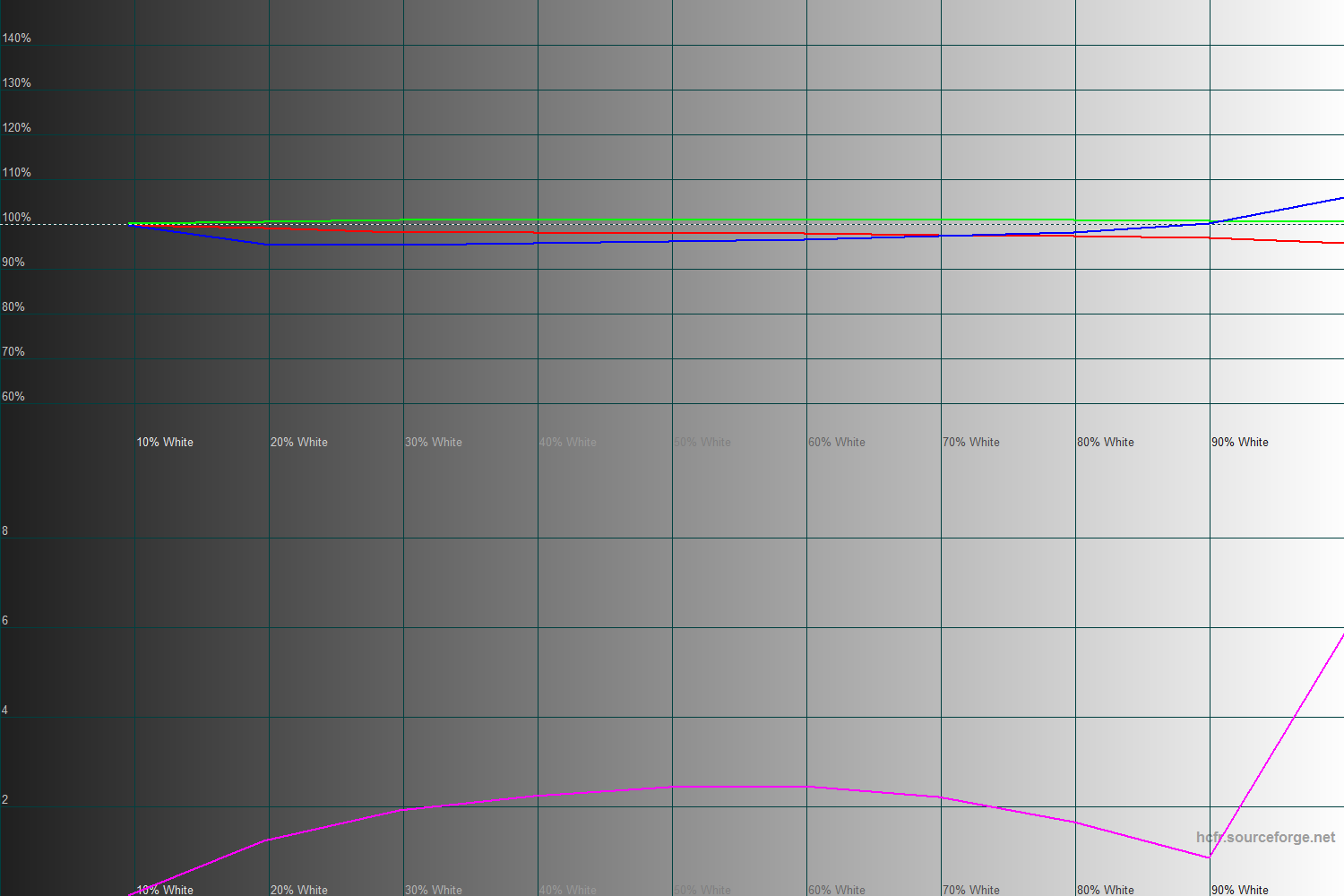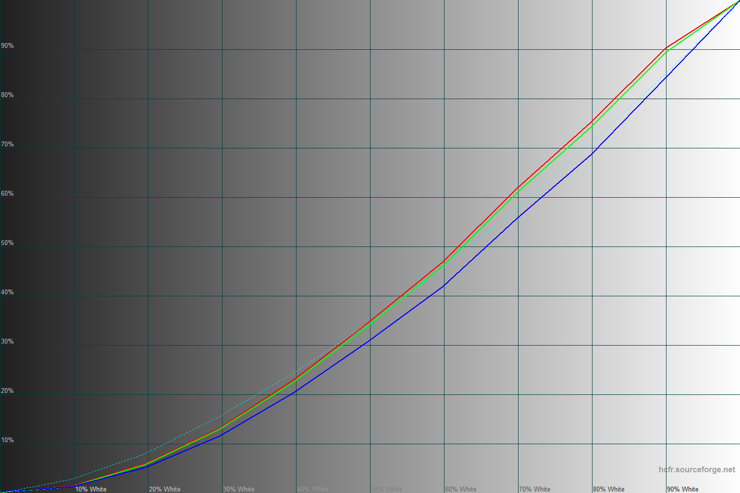 Далее переходим к цветопередаче и начнем с гамма-кривых. Тут дисплей демонстрирует нам не самые высокие показатели. Заметен сильный разброс линий, к тому же они лежат на внушительном расстоянии от референсной кривой.