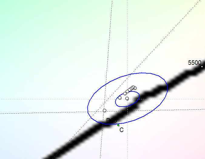 Точки серого клина лежат кучно и все попадают в диапазон DeltaE<10. Поэтому паразитных оттенков на сером градиенте практически нет.
