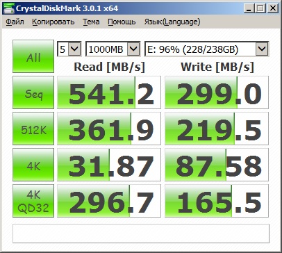 С помощью CrystalDiskMark (64bit) 3.0.1 в режиме случайных данных производится замер производительности четыре раза: