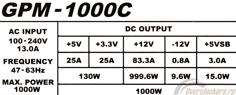 Рассмотрим мощностные характеристики. Линия 12 В здесь едина (как и у Cooler Master), максимальная сила тока на ней может достигать 83.3 А. Интересное (неровное) значение, похоже, производитель просто стремится подчеркнуть, что показатель предельно близок к 1000 Вт (83.3 х 12 = 999.6). Обычно мы округляем процентное соотношение до десятых долей, так что значение «как бы» равно 100% от номинала БП. Идеальная цифра!