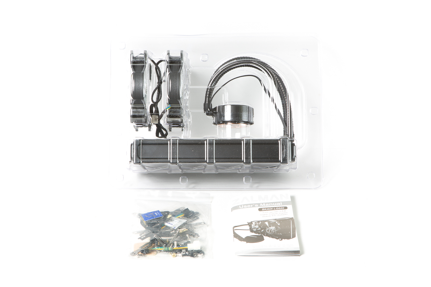 Внутри находится большой пластиковый блистер, состоящий из двух частей, в нем замурована сама СЖО и два вентилятора. Кроме того, в коробке можно найти пакет с болтами, креплениями и дополнительными аксессуарами, а также сложенную вдвое маленькую книжку-инструкцию.