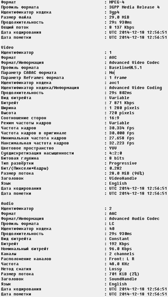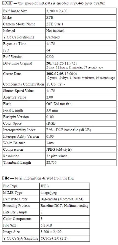 Информация EXIF фото- и видеофайлов, полученных при помощи камеры ZTE Star 1.