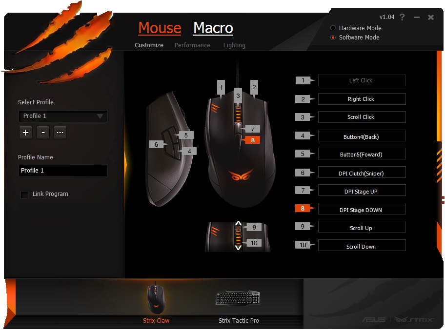 Главным достоинством мыши, несомненно, является сенсор PixArt PMW3310DH-AWQT, который отлично справляется с обработкой перемещений на всех популярных поверхностях (за исключением зеркала). В числе его плюсов и неплохой диапазон разрешений, которые быстро настраиваются в программном обеспечении, причем необходимое значение выбирается с помощью специальных кнопок «на ходу». Особые недостатки у манипулятора отсутствуют. Что касается поставляемого в комплекте ПО под названием Strix Software, то оно предоставляет оптимальный набор возможностей, которых должно хватить большинству пользователей.
