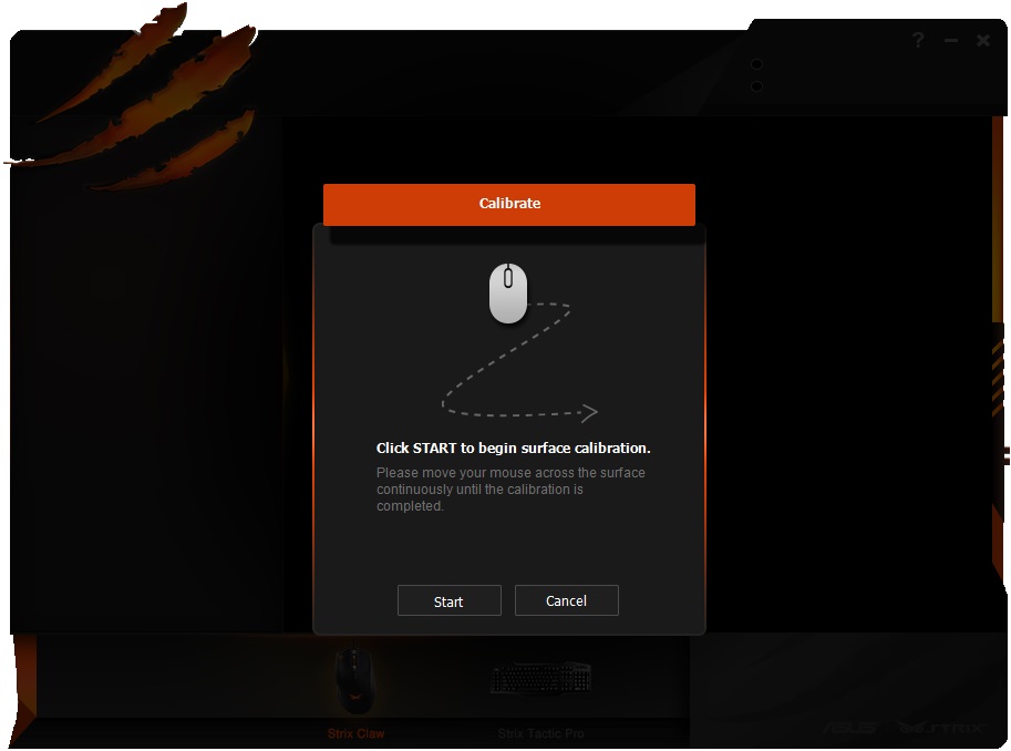Интересна и полезна функция калибровки высоты отрыва ASUS Strix Claw от поверхности. Для этого просто нажимаем на кнопку Calibrate и выполняем все по всплывающим подсказкам.