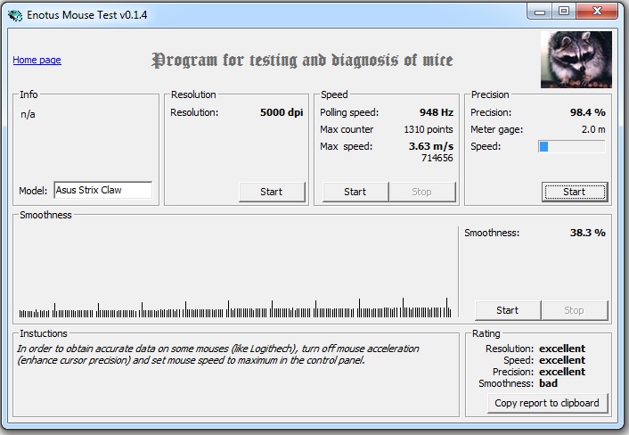 В качестве тестовой программы была выбрана доступная утилита Enotus Mouse Test v0.1.4. Полученные с ее помощью результаты представлены на скриншоте.