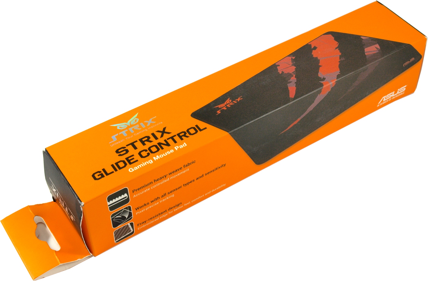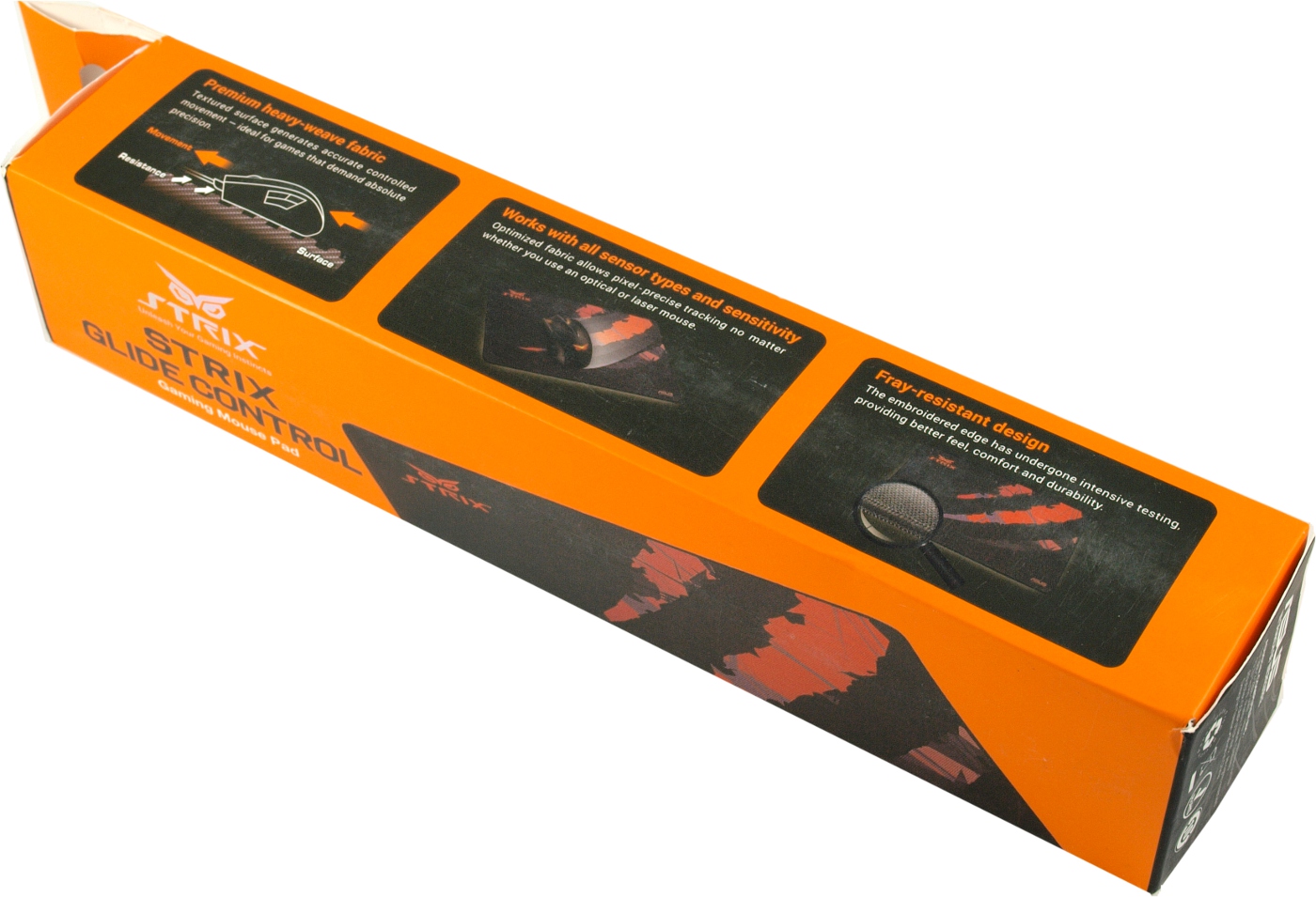 Игровая поверхность ASUS Strix Glide Control поставляется в небольшой упаковке с оранжевой полиграфией.